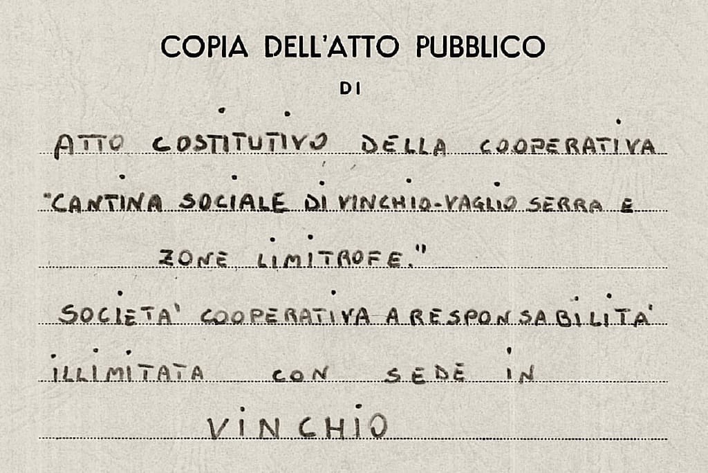 Dopo tanti incontri necessari a superare l’antica rivalità tra i due Comuni, la Cantina cooperativa di Vinchio e Vaglio Serra nasce nel febbraio del 1959, come risposta ad una situazione di mercato estremamente punitiva per il lavoro contadino e la sua sostenibilità economica. Le uve erano infatti vendute a chi le vinificava, a prezzi bassissimi e spesso in altre zone del Piemonte.