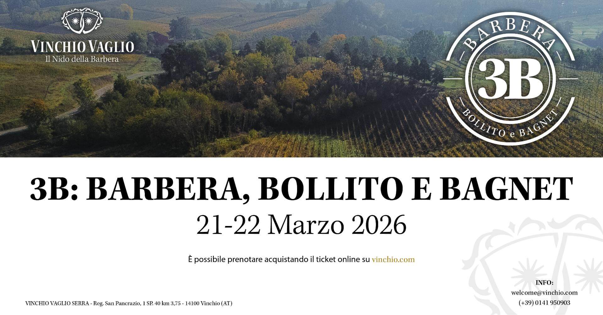 Anche quest’anno torna l’attesissimo 3B: l’evento di Vinchio Vaglio dedicato alle tre anime del nostro territorio. La Barbera, il gran Bollito misto piemontese e il Bagnet si uniscono per due pranzi e una cena davvero squisiti.