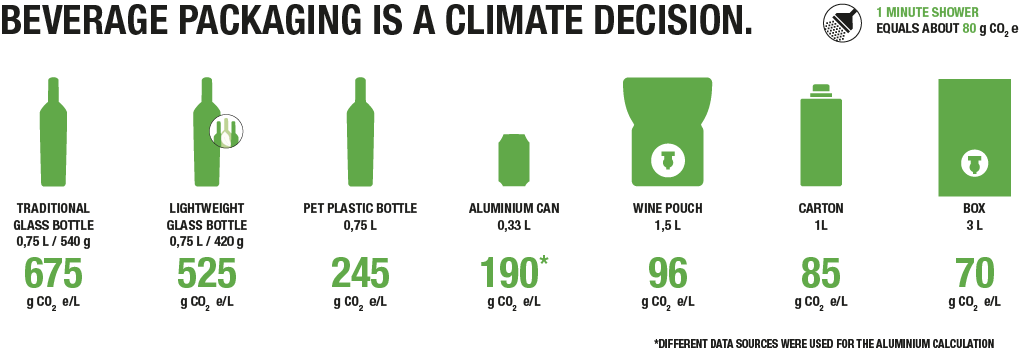 The carbon footprints of different types of wine packaging per litre of beverage: