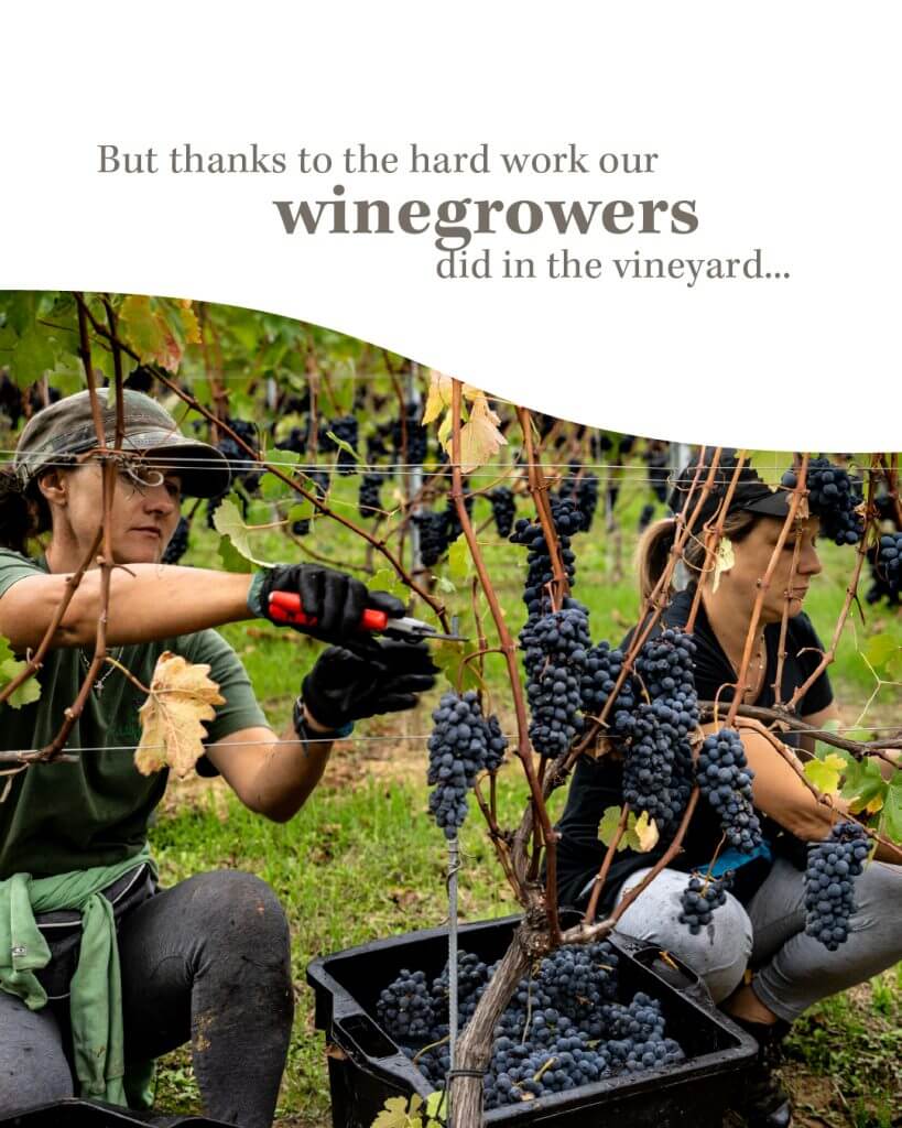 Then came the long-awaited harvest time, moved forward from the previous two editions, and… it rained! The September rain kept the rows of vines and the vineyard headlands damp and muddy, a problem that affected and hindered the harvest, making it tremendously difficult. There had not been a harvest in such conditions for many years: the last year with such a wet and muddy harvest was 2002.
