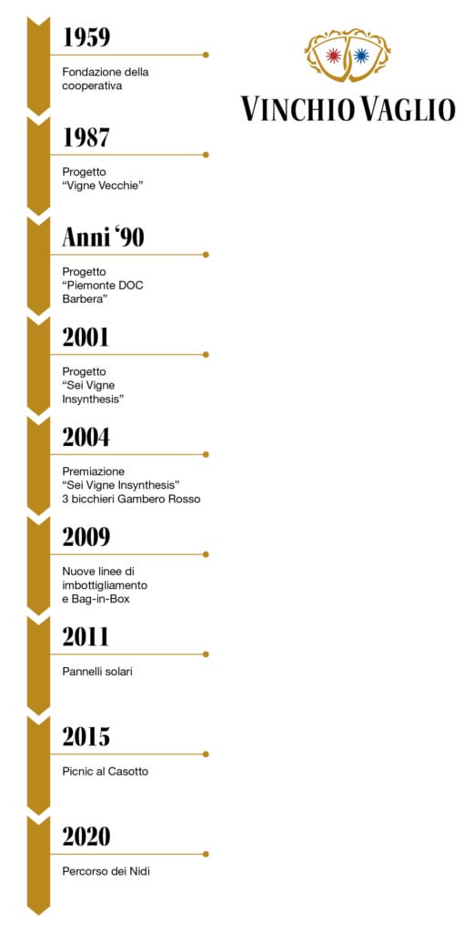 La cantina Vinchio Vaglio è nata nel 1959 e da allora ne sono cambiate di cose, in vigna, in cantina, nel mondo. Sono mutati i gusti dei consumatori, le tecnologie della viticoltura ed è cambiato anche il territorio nel quale ci muoviamo. Se guardiamo poi ai recenti avvenimenti degli ultimi anni è facile per chiunque rendersi conto della repentinità dei mutamenti storici che stiamo vivendo: crisi sanitaria, emergenza climatica e problemi energetici sono solo “la punta dell’iceberg” di cambiamenti socio-politici profondi.