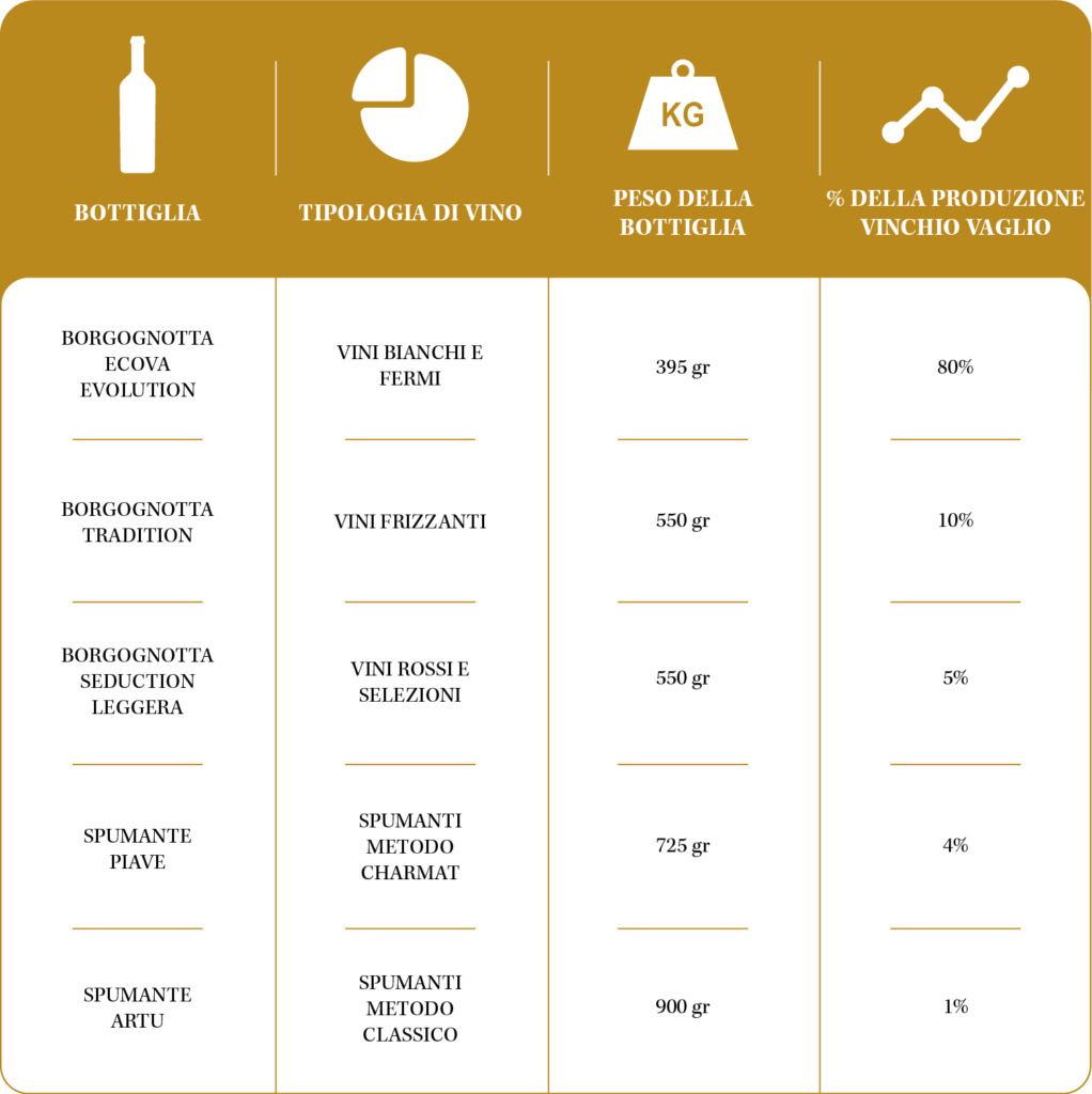 Per questo motivo utilizziamo prevalentemente bottiglie leggere e negli ultimi 15 anni abbiamo creduto fortemente sul formato Bag in Box per i vini della quotidianità.