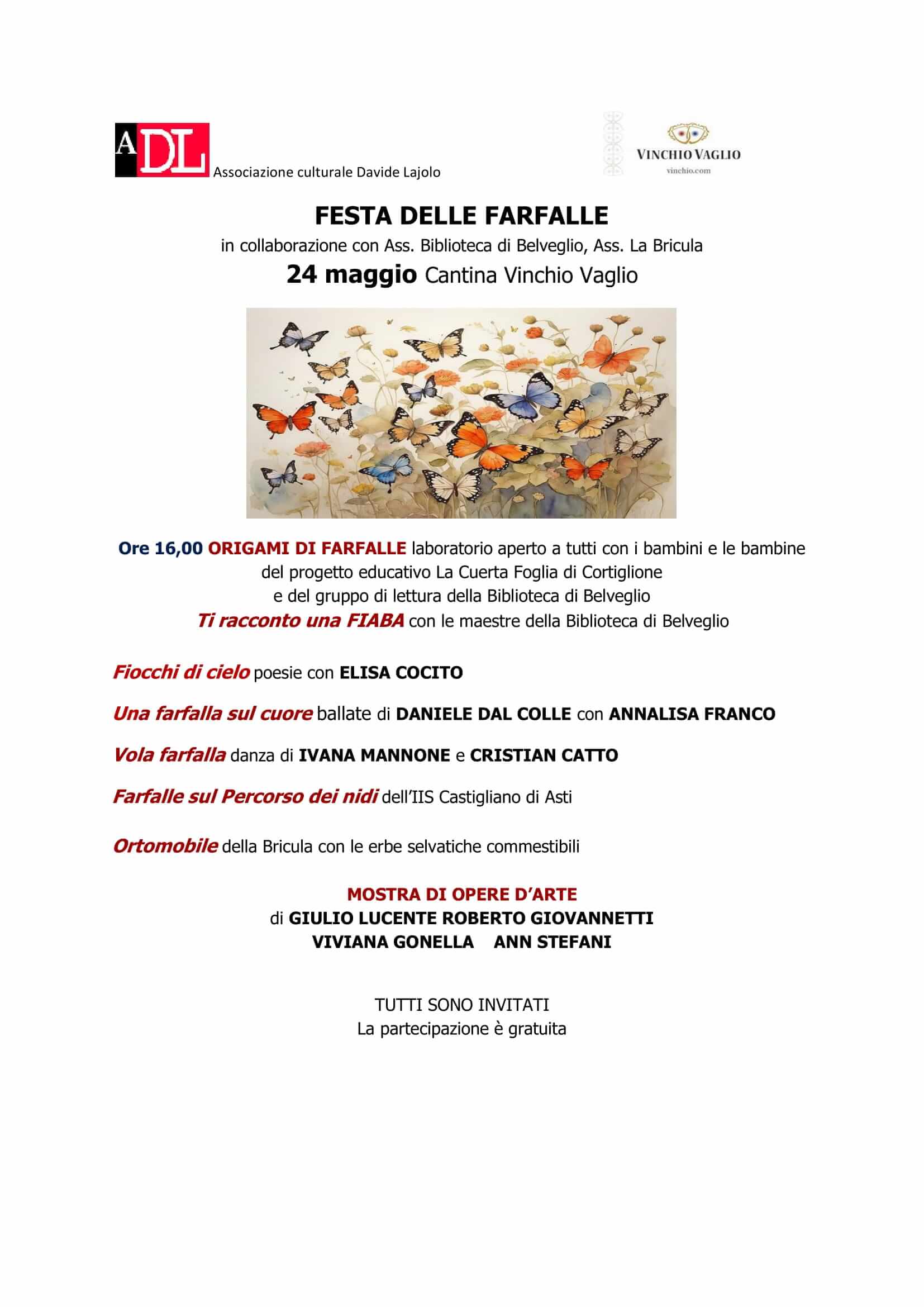 Nel pomeriggio, in collaborazione con l’Associazione Davide Lajolo, si terrà la Festa delle Farfalle.