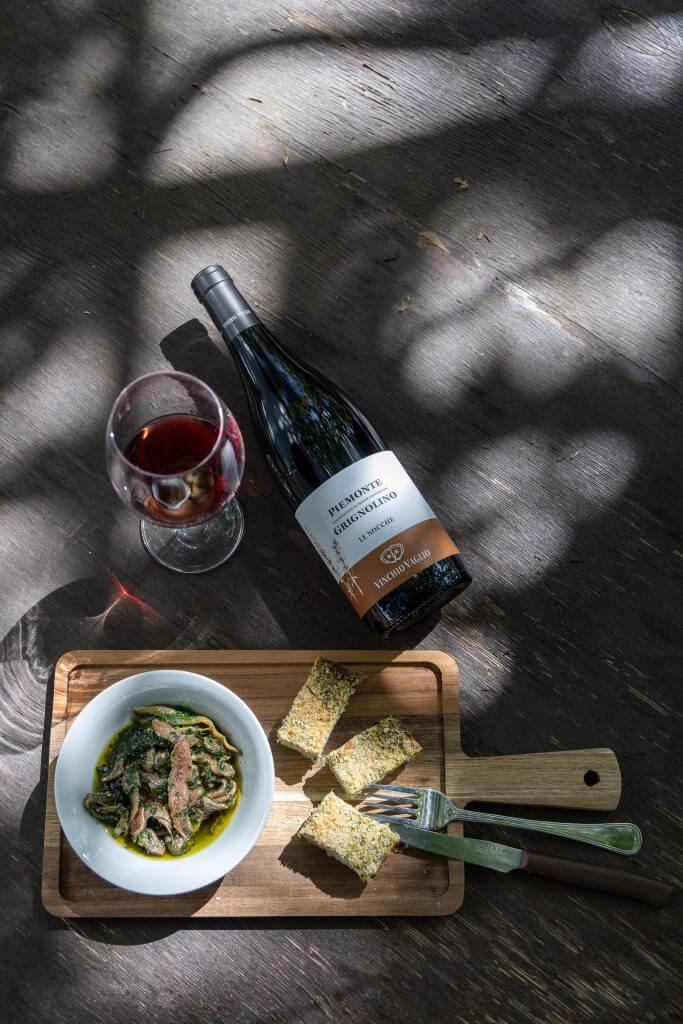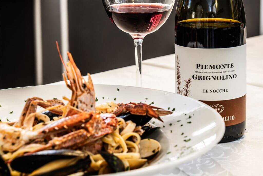 Piemonte DOC Grignolino Le Nocche, con il suo tannino fine, la freschezza viva e le note di mandorla, si rivela perfetto con un piatto saporito e gustoso ma non grasso come lo spaghetto allo scoglio.